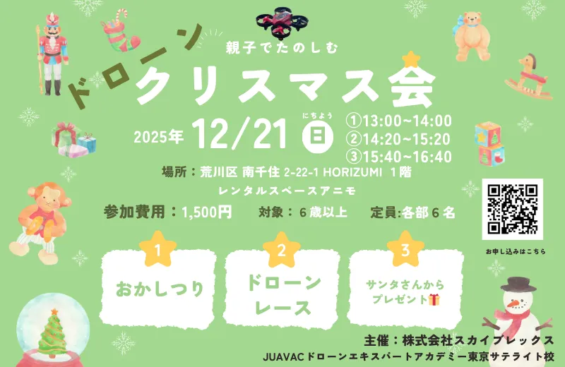 株式会社スカイブレックス / JUAVAC東京サテライト校が贈る、ワクワクいっぱいの「ドローンクリスマス会」で、親子でいっしょに最先端のテクノロジーを体験するチャンスです!ドローンを実際に操縦し、空中でのミッションに挑戦しながら、忘れられないクリスマスを過ごしましょう。