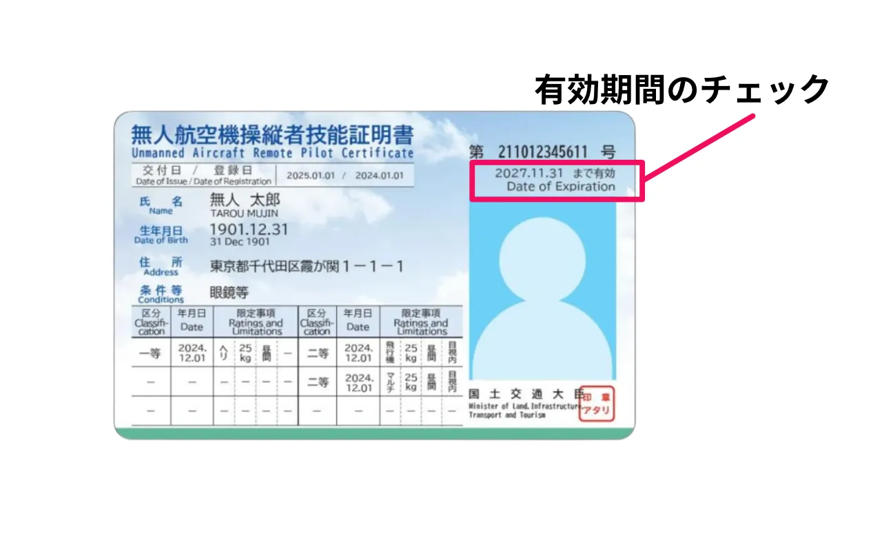 無人航空機操縦士資格(一等資格・二等資格)の有効期間は3年です。