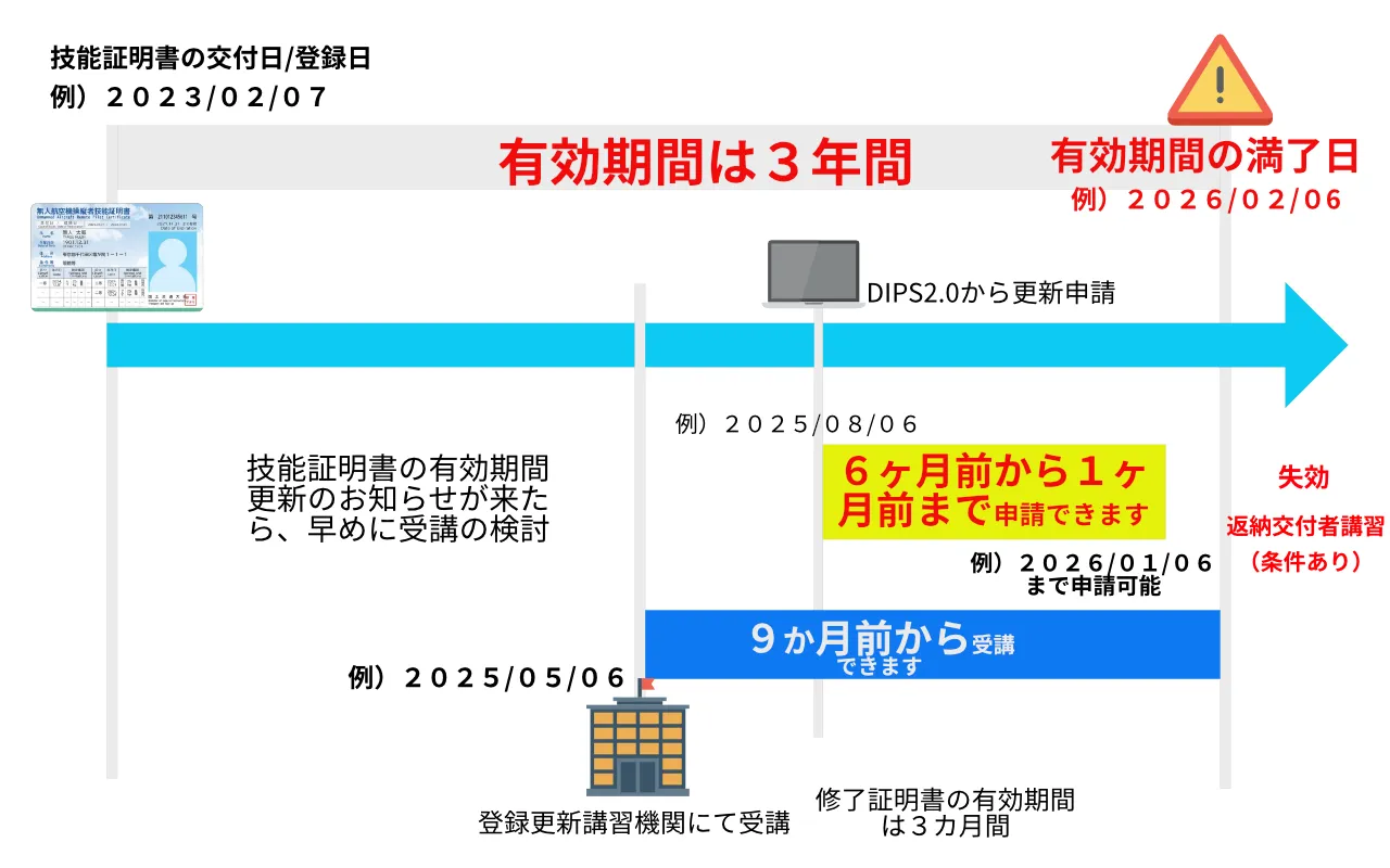 - 更新講習の修了証明書は、有効期間が3ヶ月間となります。技能証明の有効期間満了日より、9ヶ前から更新講習の受講が可能です。