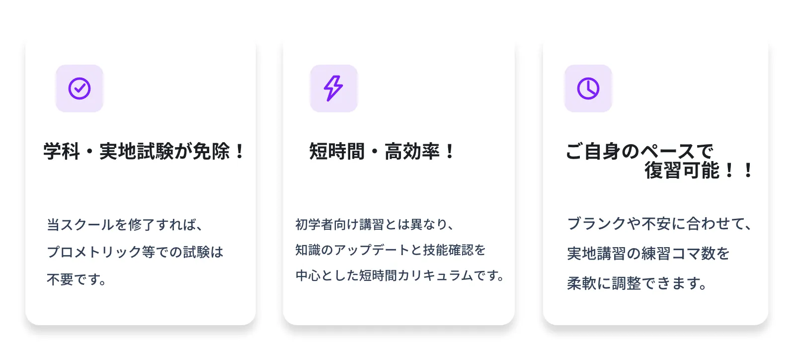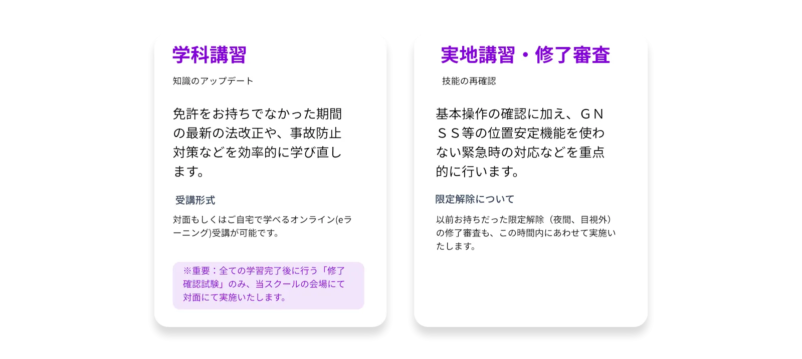 来校(試験・実地・修了審査)修了確認試験(学科・対面)、実地講習(ご自身の選んだコマ数で復習)、修了審査(実地)